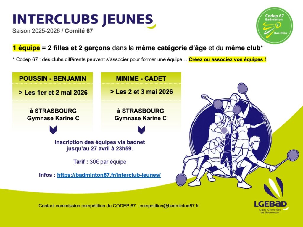 Minime – Cadet : formule en week-end, les 2 mai et 3 mai 2026 à Strasbourg. Inscription de vos équipes via Badnet avant le 27 avril 2026.
